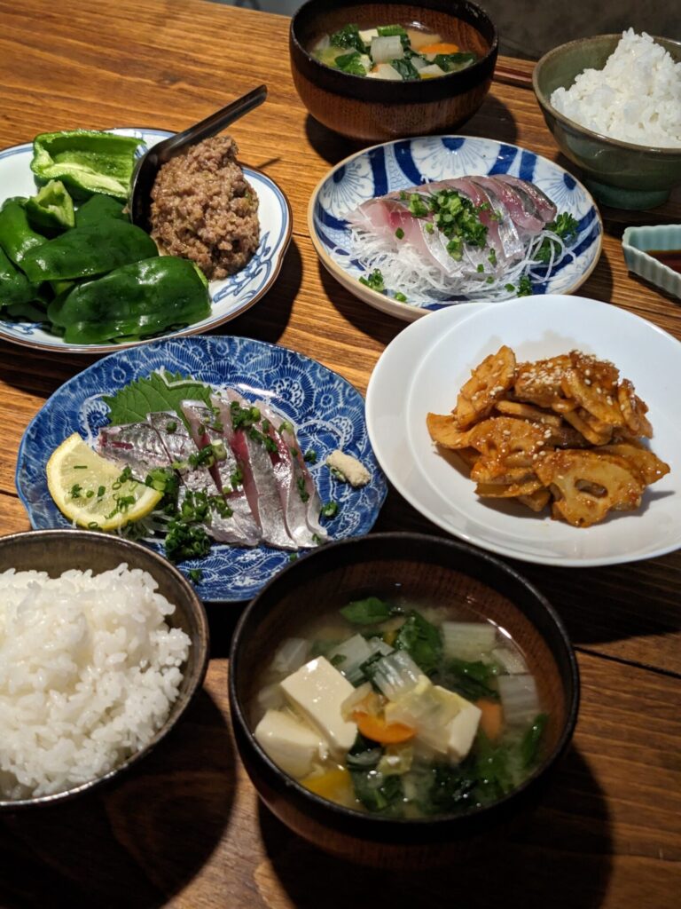 アジの刺身と野菜たっぷり味噌汁、パリパリピーマンx肉みそに金平でごはん