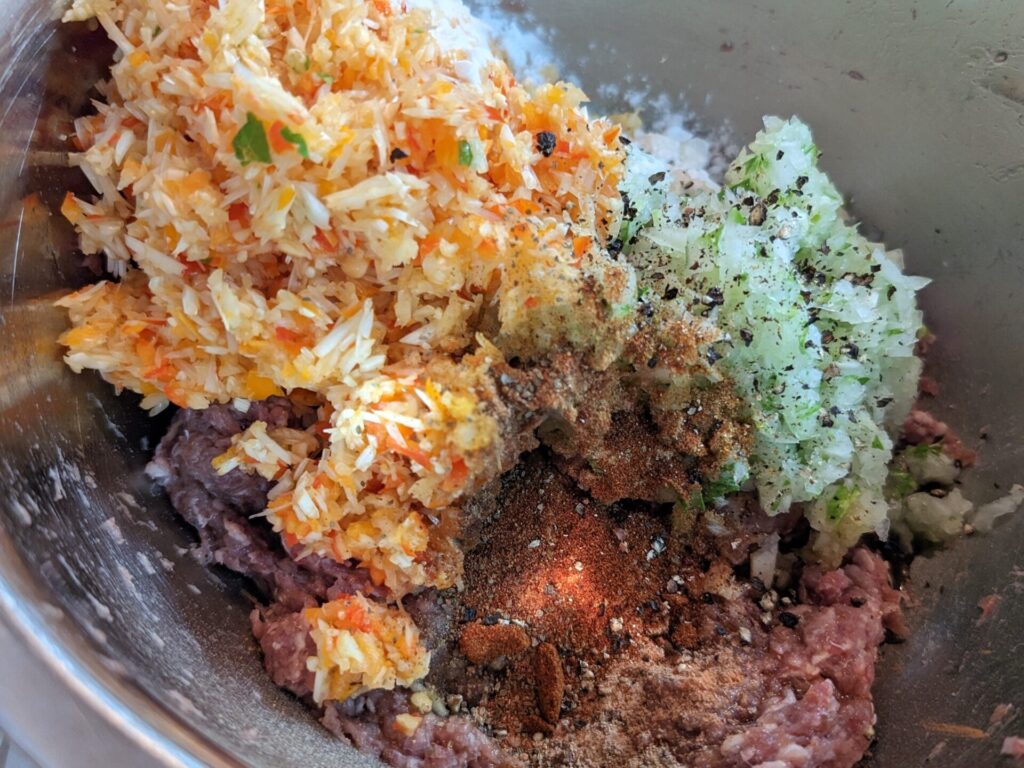 中身はラムの赤身ミンチ、柔らかくするのに塩麹とちょい砂糖、酒、たっぷりの野菜(玉ねぎ、セロリ、パプリカ、えのき)、片栗粉を加えよく混ぜて。