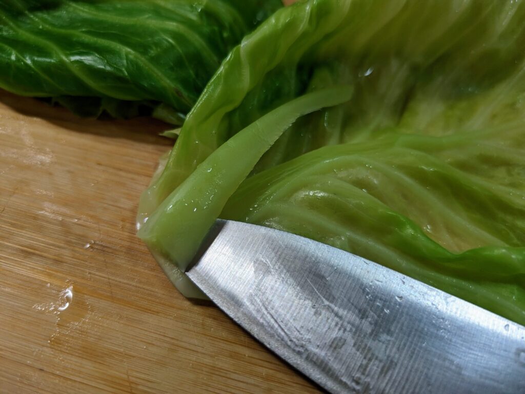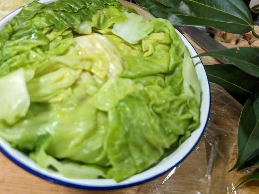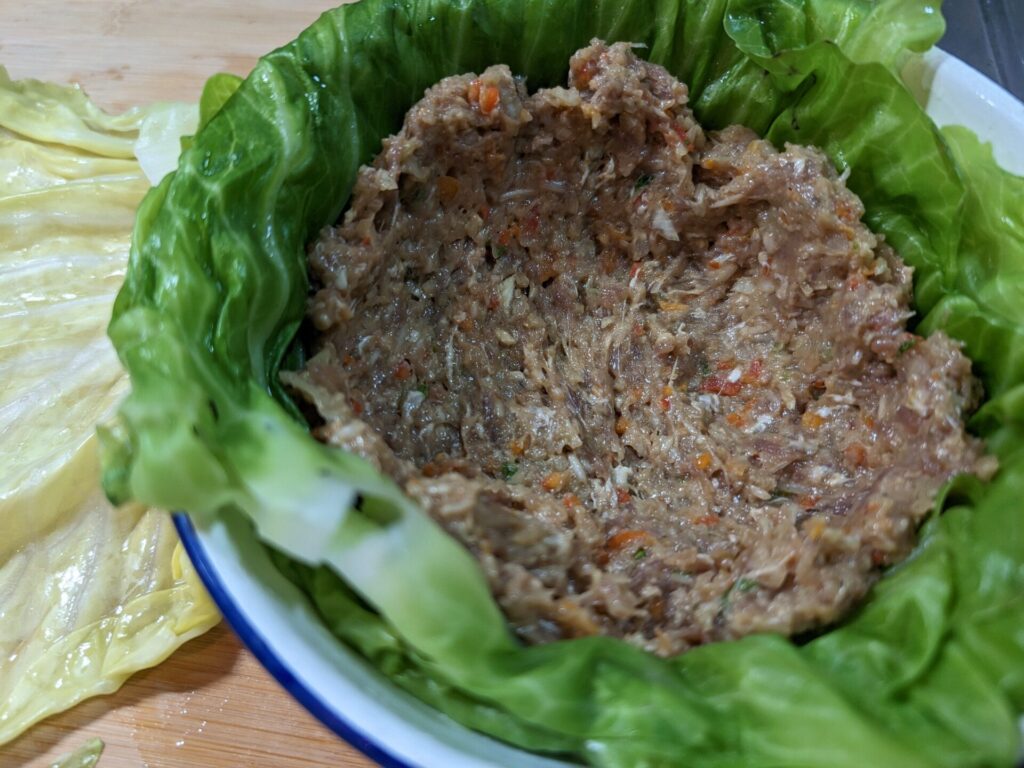 さっと茹でて一枚ずつ剥がして芯のとこを薄くしたキャベツをボウルに敷いて、ミルフィーユ状にミンチとぴっちり重ねて最後余ったキャベツで蓋をして。