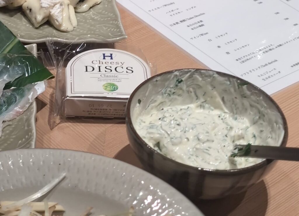 サワークリームに、刻んだミント、フェンネル、パクチーと塩、粉山椒、かぼす汁、レモンオリーブオイルを混ぜました。