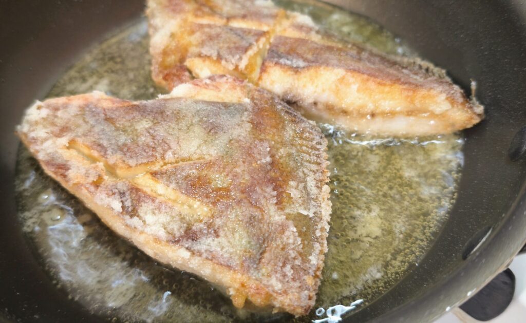 フライパンにこめ油を温め揚げ焼きにしていきます。