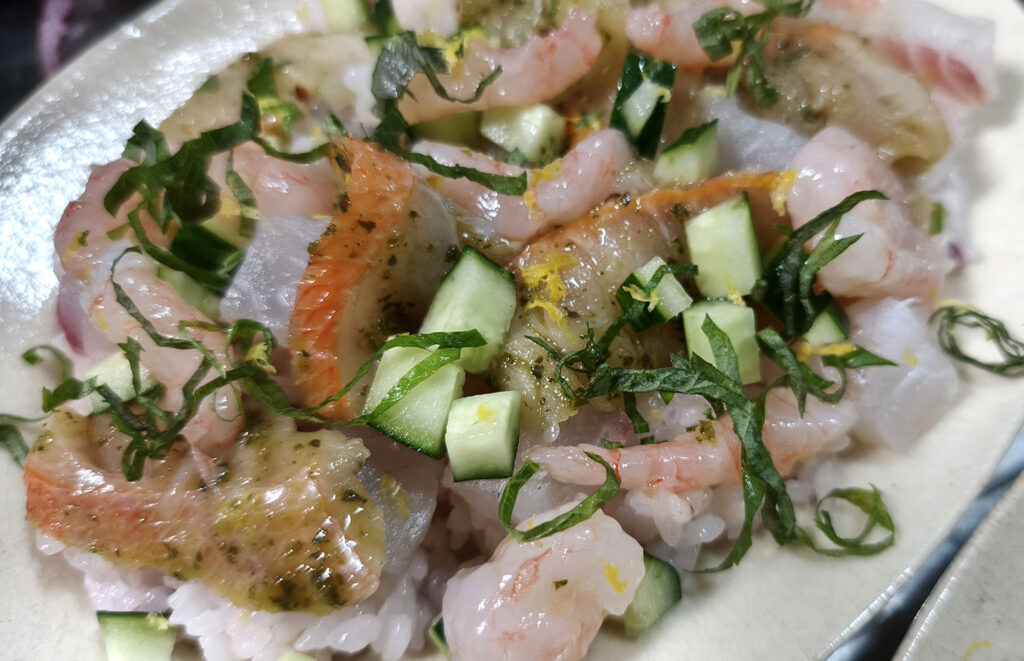 甘エビは尾を取って、柚子油と塩で軽く和えておきます。