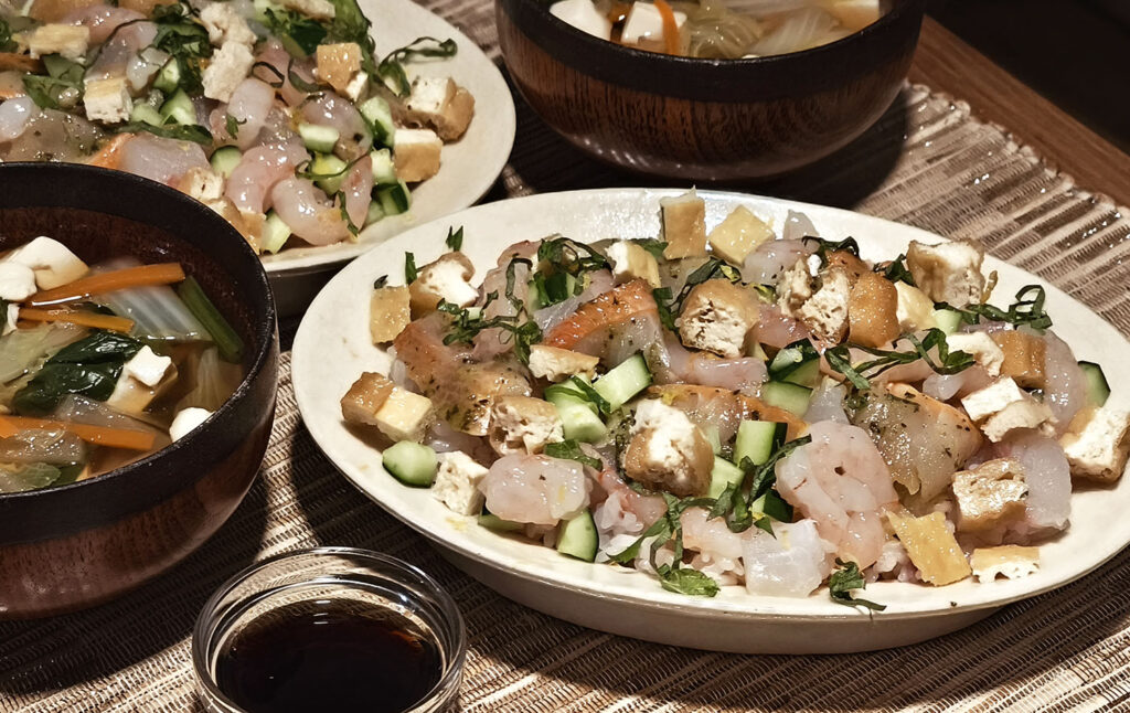 フィシュルという未利用魚の味つけパックに真鯛と甘エビをプラスしました。