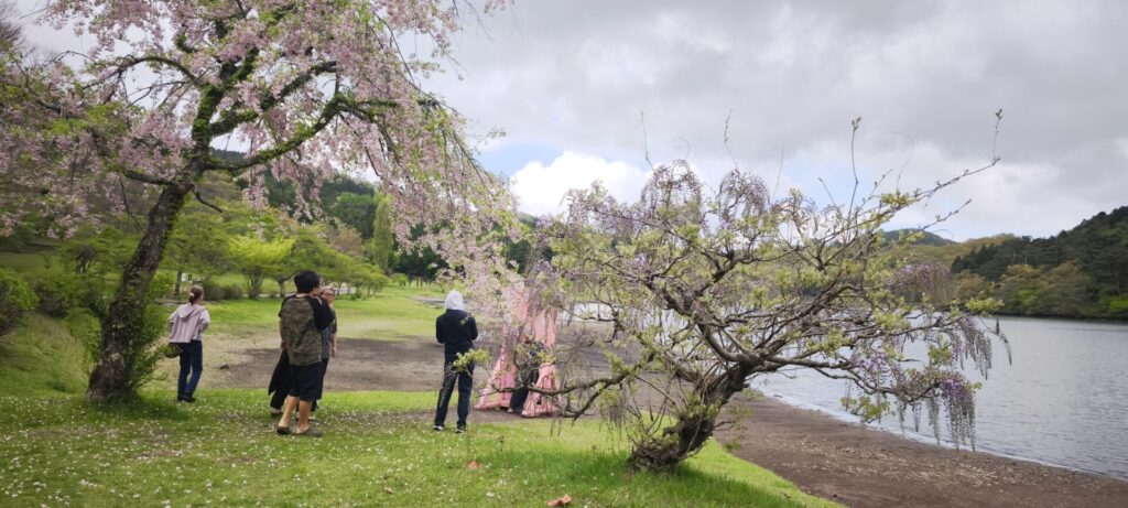 桜と藤の花が湖畔にしだれていて夢のような風景。ピンクのドアはうーん……。