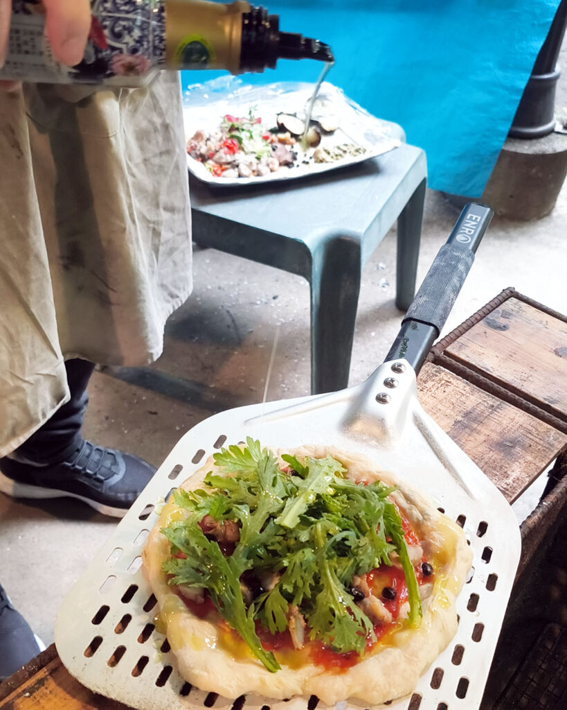 オイルは南アフリカリオ・ラルゴEXVオリーブオイルを使ってもらいました、口が細くて回しかけやすい!軽い生地も美味しかったし焼きに十分慣れた最後の春菊ピッツァが美味しかった~縁までしっかりこんがり。