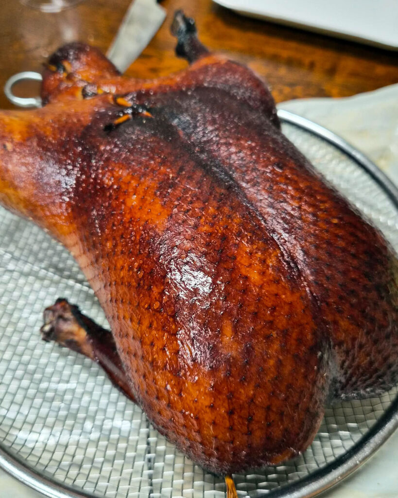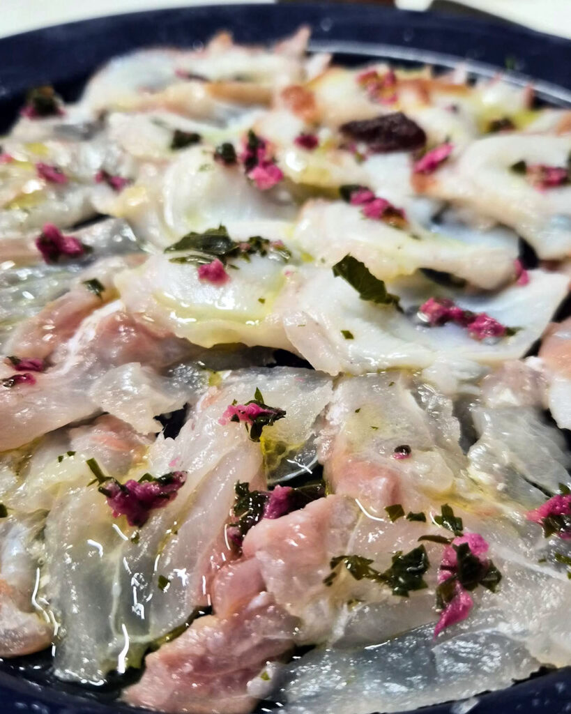 みちさんが即席で作った桜の塩漬けを散らした真鯛と蛸のカルパッチョ、美味しかった~オイルは柚子油。あと2日目も北京ダックはこめ油を回しかけて皮パリに(ミカサ君が)。