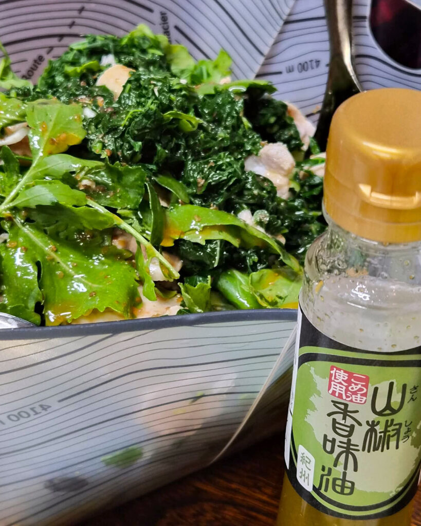 あと鬼おろし大根たっぷりに豚しゃぶ、ワイルドなセルバチコとさっと茹でたケールを胡麻ポン酢と山椒香味油で和えたサラダにしました。
